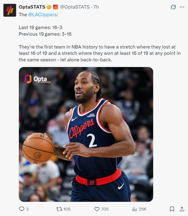 快船115-103大胜爵士拿到三连胜,这场比赛快船一度领先爵士达到21分,两支球队的硬实力明显不在一个层次上面,如今的快船已经不再是赛季初那支6胜21负的鱼腩球队,他们距离五成胜率只差2场,最近的19场比赛他们赢下其中16场同期联盟第一。