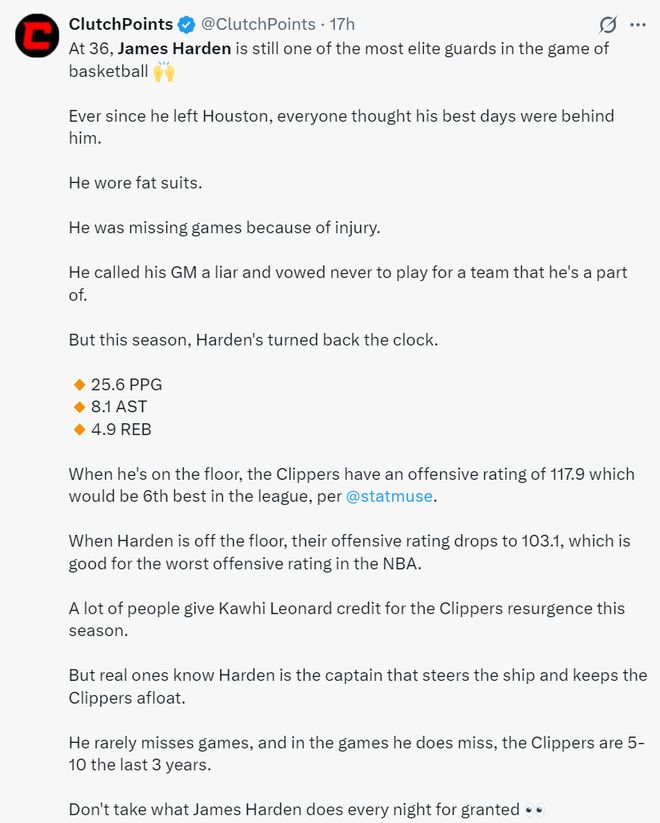 美媒Clutchpoints写道:36岁的哈登依旧是篮球界最顶尖的后卫之一,本赛季的哈登场均25.6分8.1助攻4.9篮板,当他在场时快船进攻效率达到117.9排在联盟第六,而当哈登下场时快船进攻效率下滑到103.1联盟倒数之一,哈登在场/不在场进攻效率差值高达14.8。