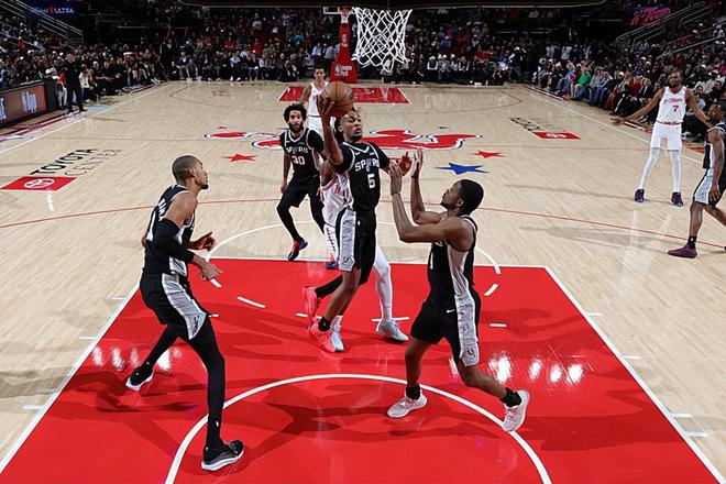 本场比赛中,马刺的先发得分后卫斯蒂芬-卡斯尔(Stephon Castle)也算是摆脱了之前几场比赛的糟糕状态。卡斯尔全场出场32分44秒,投篮12中7,三分线外2中1,罚球3中1,得到了16分5篮板6助攻2抢断的全面数据,还有2次失误和3次犯规,正负值为+3。卡斯尔在进攻端效率稳定,他的突破能力和终结能力相当不错,他也通过各种方式得到了不少分数,他也没有太过执拗,没有进行太多不合理的投篮,他还展现出了自己的传球能力和组织能力,在进攻端的贡献度非常全面。不仅如此,卡斯尔在防守端也是保持了极高的强度和专注度,证明了自己是一名非常优秀的防守者。总体来看,卡斯尔在本场比赛中的表现非常不错,他也为球队的胜利提供了不小的支持。