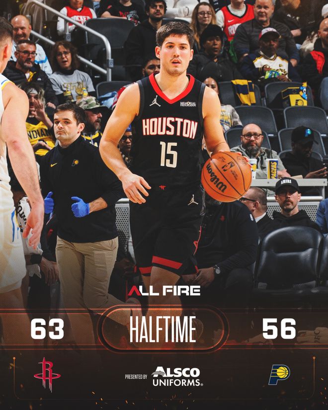 申京和霍勒迪合取5分开始第二节,火箭队反超领跑。30平、32平后麦康奈尔三分命中,马瑟林打3分成功,步行者队再次领先。申京保持攻击性又拿4分追成41平,沃克三分回应,奈史密斯打3分成功,半场前3分15秒时步行者队以52-46领先。史密斯突然找到手感,连中2个三分球率队打出11-2的反击波,火箭队反超3分。马瑟林两罚追近,泰特、汤普森和谢泼德轮流得分,火箭队连拿6分结束第二节,他们以63-56领先7分进入半场休息。
