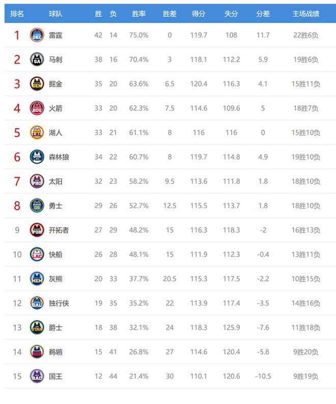 雄鹿排名东部第12,雷霆惨败给残阵雄鹿,出乎了业界预料,雷霆输球后42胜14负,继续排名西部第一,不过在全联盟的排名被活塞反超,活塞成为联盟第一,雷霆变成第二。雷霆输球给马刺送上好礼马刺只比雷霆多输2场了,这个差距并不大,马刺有希望冲击西部第一了。