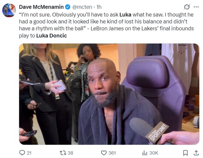 詹姆斯赛后也表示,东契奇应该投那是一个空位,传给我时有点失去平衡了。