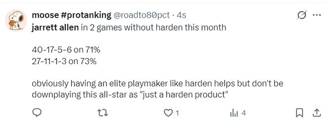 有数据媒体写道,二月份阿伦在没有哈登的情况下打了两场比赛,一场40分17篮板5助攻2抢断4盖帽,真实命中率71%;一场27分11篮板1助攻2抢断1盖帽,真实命中率73%,这两场比赛合计拿到67分28篮板,显然拥有哈登这样的组织核心对阿伦有所帮助,但不要将阿伦这位全明星内线贬低为“仅仅是哈登帮助的产物”。