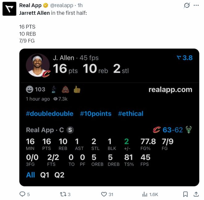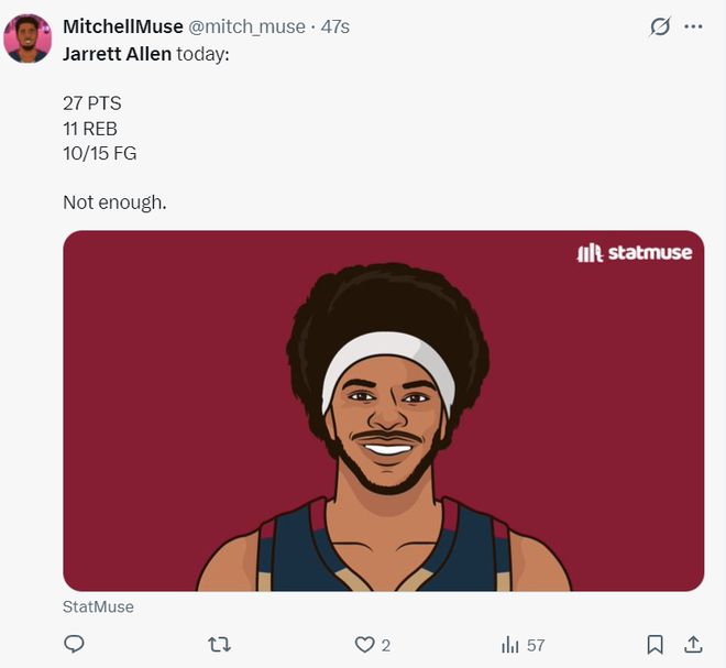 这导致整个下半场阿伦只有1个篮板球进账,全场比赛32分钟,15中10,罚球8中7,拿到27分11篮板1助攻2抢断1盖帽,命中率66.7%,真实命中率72.9%,正负值-10。虽然没有骑士三巨头阿伦依旧拿到了爆炸的两双数据。