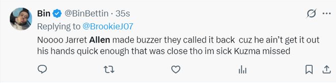 骑士球迷对阿伦的绝平超时非常难过,他表示NO~阿伦还没有把球跑出去,球出手前已经亮灯了就差那么一点点,我太难受了。