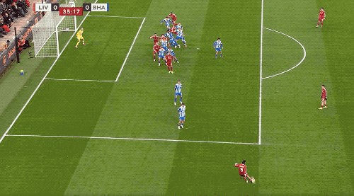 第40分钟,还是来自萨拉赫的传球,基耶萨的射门,被范赫克伸出一脚,完成解围。