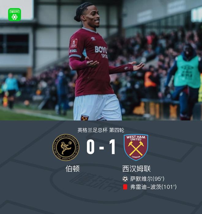 足总杯:西汉姆联1-0伯顿晋级,萨默维尔加时制胜,波茨染红