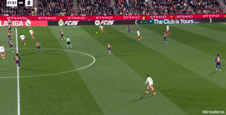 第43分钟,亚马尔斜传,拉菲尼亚打门击中立柱